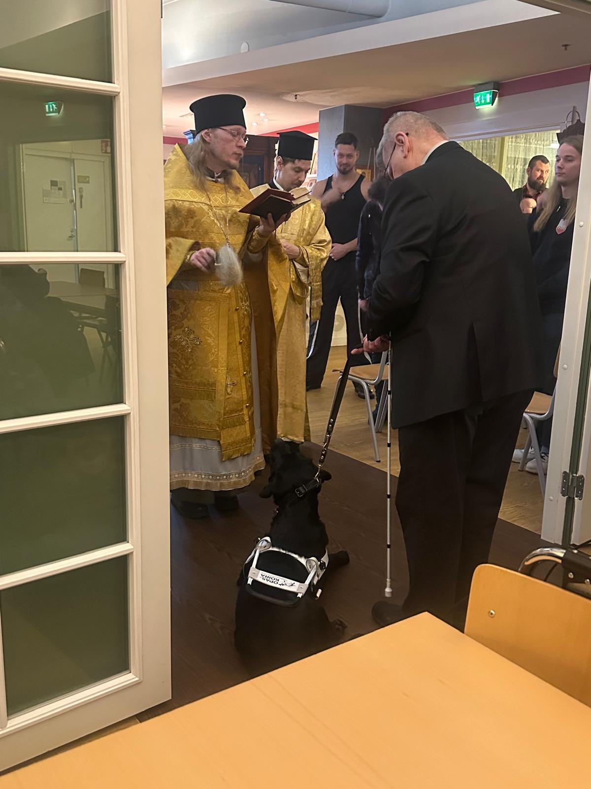 Helsingin Metropoliittakunnan säätiö myönsi merkittävän apurahan tietokirjailija ja tutkija Timo Lehtoselle 16.5.2023. Kuvassa Helsingin ja koko Suomen arkkipiispa Leo, Timo Lehtonen ja opaskoira Laika.